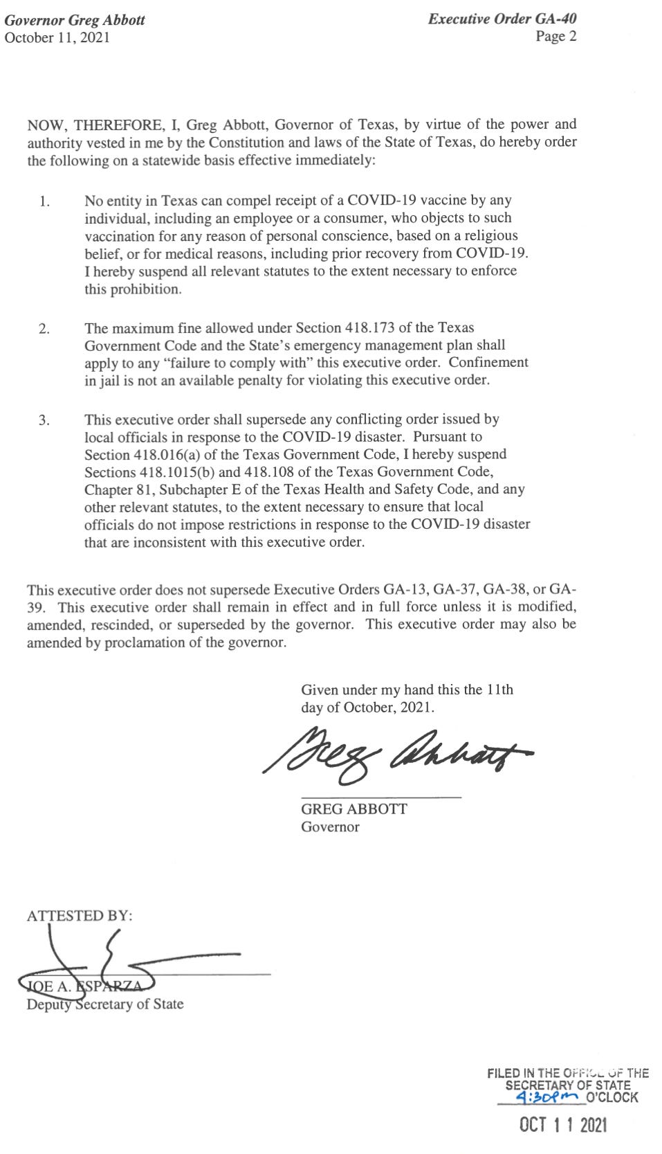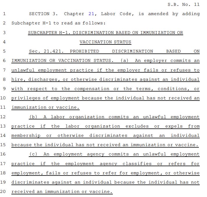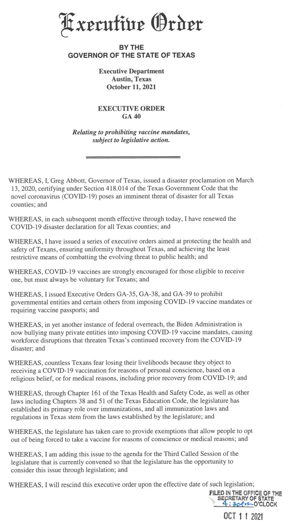 Below I’ve included screen shots of Senate Bill 11 (text, PDF) as well as screen shots of Governor Abbott’s October 11, 2021 Executive Order (PDF).